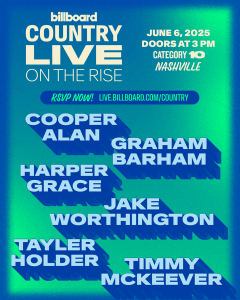 The Billboard Country Live celebration extends to Friday, June 6, with a second night of music that will spotlight “Country on the Rise,” shining a light on the genre’s future hitmakers. Featured performers will include Cooper Alan, Graham Barham, Harper Grace, Jake Worthington, Tayler Holder and Timmy McKeever.