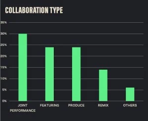 The percentage of the collaborators’ nationalities was calculated based on the number of artists. The United States (27%) had the highest percentage, with many collaborations with rappers such as Megan Thee Stallion and Big Sean. The United Kingdom (18%) featured artists associated with Hikaru Utada, such as Sam Smith and A.G. Cook.